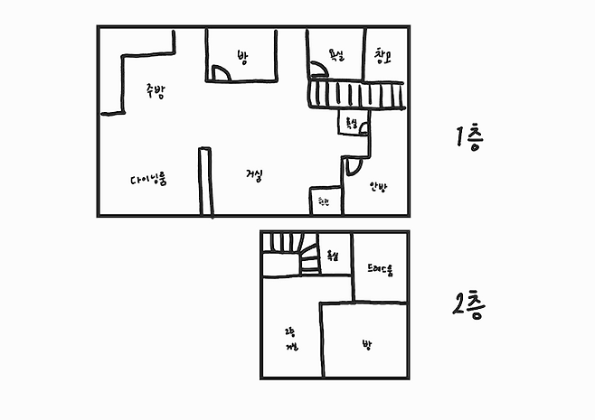 오래된 집이라 도면이 없어서 제가 그렸어요.ㅎㅎ... 2층은 1층의 절반 정도예요. 부모님과 언니는 1층에, 저 혼자 2 층에 살고 있답니다. 다이닝룸까지 포함해 방이 5개, 욕실은 3개예요.