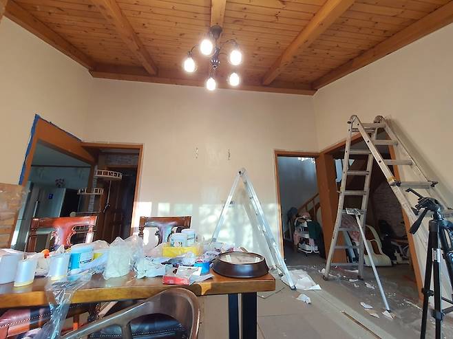 셀프 페인팅을 하는 동안 난장판이었던 집의 모습이에요. 거실과 안방, 주방, 2층 거실까지 모두 페인트칠을 새로 하는 초대형 프로젝트였어요. 요즘에는 기술이 좋아져서인지 페인트 냄새도 하나도 안 나고, 생각보다 금방 말라서 비교적 수월하게 작업했어요.