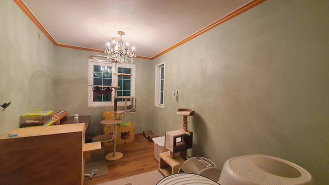 안방과 같은 올리브그린으로 페인트칠 했어요. 페인트칠 직후... 정리하기 전의 모습이에요.ㅎㅎ 2층 거실이 생각보다 넓은데, 고양이들이 아니었다면 죽은 공간이 되었겠다는 생각을 해요. 가족들이 모일 때는 아무래도 더 넓은 1층이나 마당을 택하게 되고, 저는 바로 옆에 있는 제 방에 주로 머물게 되니까요.
