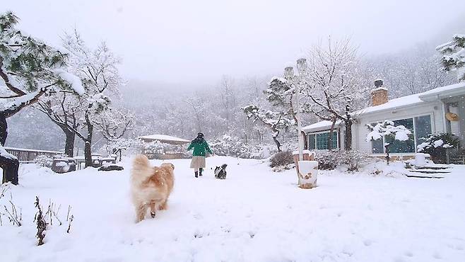 모두 제 브이로그 중 한 장면이랍니다. 시골집의 풍경은 꽃이 피면 꽃이 피는 대로, 눈이 오면 눈이 오는 대로 아름다워요. 눈 오는 날이면 신난 강아지들과 함께 나가서 눈사람을 만들곤 해요. 겨울이 기다려지는 이유 중 하나예요.