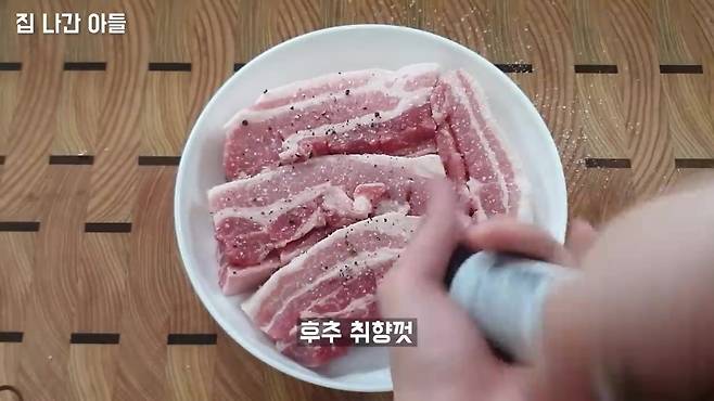 고기에 소금, 후추를 골고루 뿌려 밑간합니다. 앞뒤로 고루 뿌려주는 것이 중요해요.
