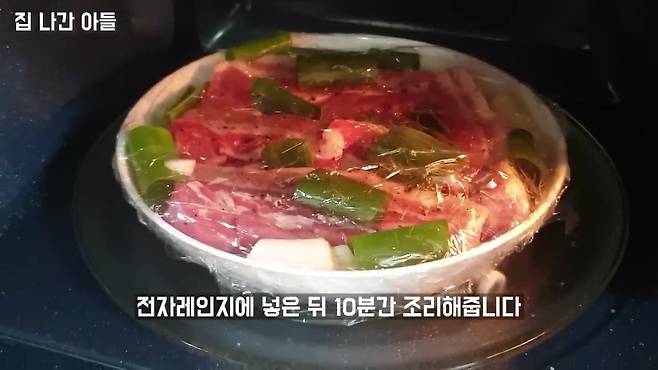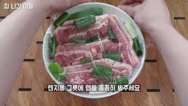 전자레인지용 용기에 고기를 담고 랩을 단단히 씌워줍니다.