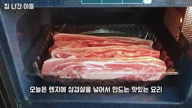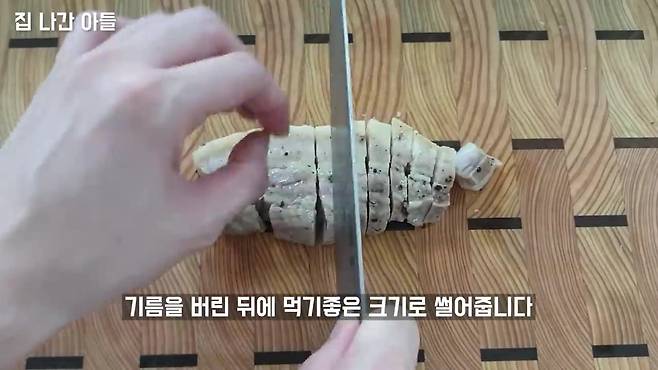 전자레인지에서 익힌 삼겹살은 꺼내 기름을 따라 버리고 썰어줍니다. 한 입 크기로 썰면 먹기 좋아요.