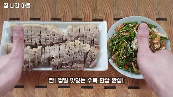 겉절이와 함께 그릇에 담아 플레이팅합니다. 상큼한 부추겉절이와 야들야들한 수육의 조화가 환상적이에요.