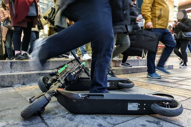 공유 전동킥보드는 아무 데나 반납할 수 있기 때문에 길거리에 놓여 있는 것이죠.