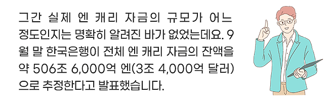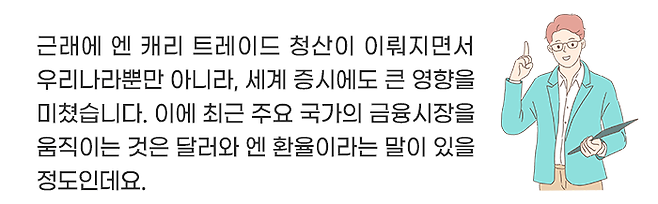 이러한 엔 캐리 자금은 주로 단기간에 높은 수익을 노리는 핫머니 성격을 띠는데, 빠르게 움직이며 수익을 좇는 이 자금으로 인해 국제 금융시장은 큰 영향을 받게 됩니다.