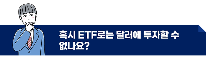 ETF는 아시다시피 주식의 형태로 상장되어 있어 손쉽게 매매가 가능하기 때문에 좀 더 투자자의 성향에 잘 맞는 달러 투자를 할 수 있습니다.