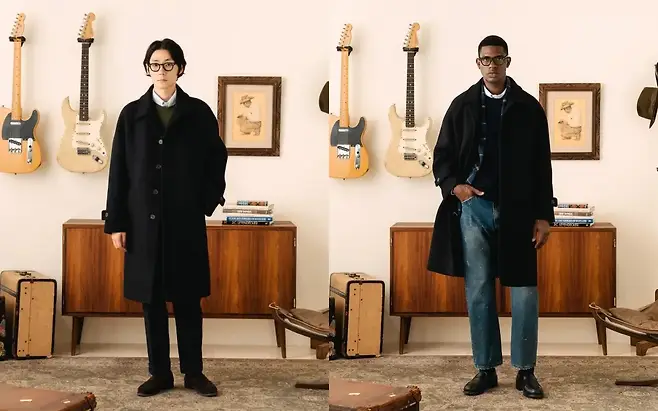 피 코트는 빈티지나 밀리터리 마니아에게 사랑을 받는다. 옛 제품을 재현하는 복각 브랜드에서 빠지지 않는 제품이 피 코트이기도 하고. 그래서일까 피 코트는 밀리터리 분위기가 짙다. 그래서 일상과 융화시키기 위해선 여유 있는 사이즈를 선택하는 편이 좋다. 기왕이면 슬림한 바지보다는 와이드한 바지와 매치해보자. 슬림한 바지와 매치했을 때 얻을 수 있는 강인한 이미지가 업무에 도움이 될 수도 있겠지만 말이다.