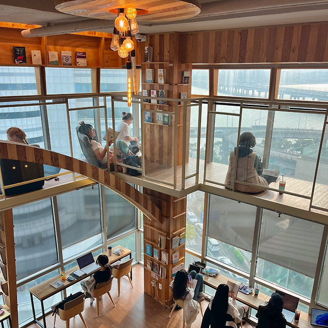 채그로 북카페는 6층, 8층, 9층에 있어요. 6층과 8층은 북카페고, 9층에는 조용한 서점과 함께 루프탑 카페가 있어요. 한강뷰는 전층에서 볼 수 있기 때문에 편안한 자리를 고르시면 되는데요. 복층 구조, 좌식, 소파 자리, 다인용 테이블 등 다양한 자리가 마련되어 있어요. 주말에는 자리가 금방 차기 때문에 서두르시는 게 좋아요!