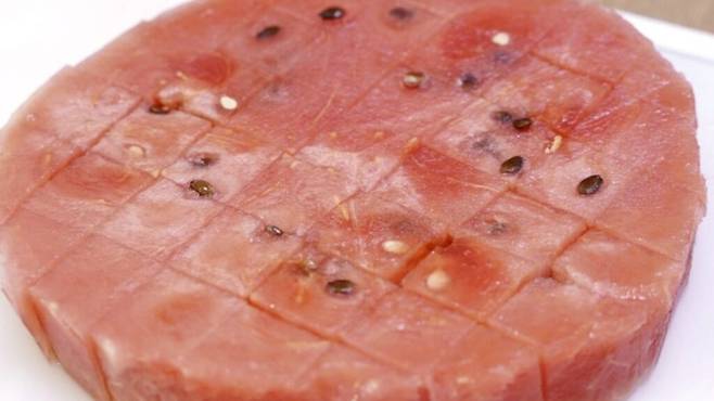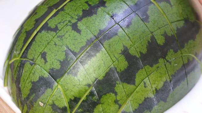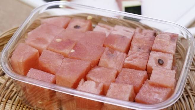 속살만 남은 수박을 일정한 간격으로 쓱쓱 썰면 한입 크기 깍두기 모양 완성!