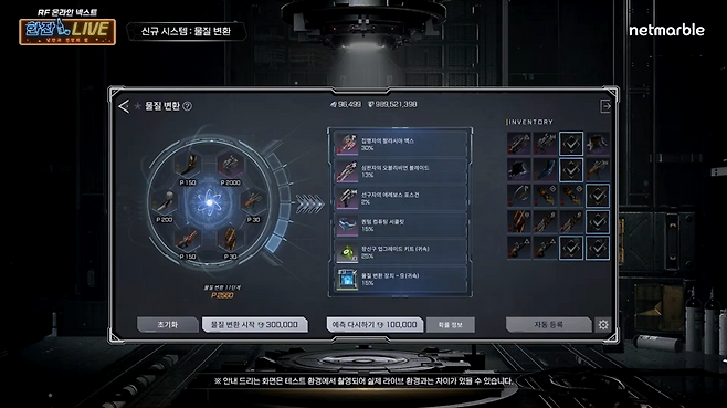 다음으로는 물질변환 시스템이다. 희귀 등급 아이템 4~6개를 넣으면, 종합 포인트에 따라 더 높은 티어의 장비를 획득할 수 있다. 예측 리스트를 보고 결과를 확인할 수 있으며, 예측 리스트가 마음에 들지 않는다면 다시 전환할 수 있다. 장비는 비귀속으로 나오나 메모리칩은 귀속이다.