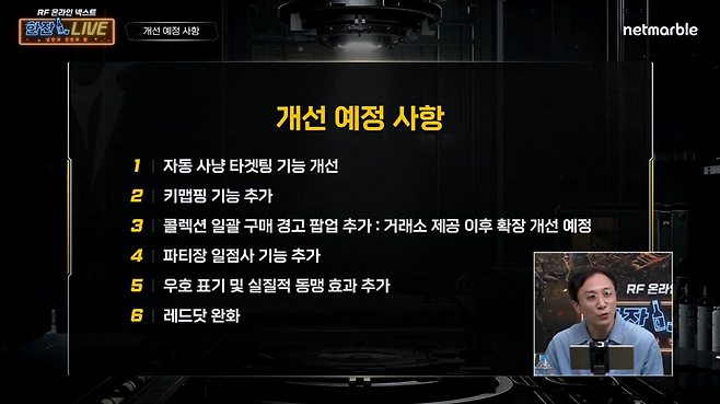 Q. 그 외의 개선 사항은? - 자동사냥 타겟팅 기능 개선, 키맵핑 기능 추가, 콜렉션 일괄 구매 경고 팝업 추가, 파티장 일점사 기능 추가 , 우호 표기 및 실질적 동맹 효과 추가, 레드닷 완화가 예정되어 있다.