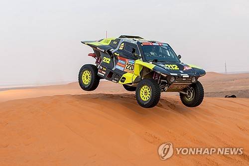 epa11818978 Wei Han of China and Li Ma of China compete with their Red-lined Hwm T1+ for Hanwei Motorsport Team during Stage 6 in the 2025 Dakar Rally from Hail to Al Duwadimi, Saudi Arabia, 11 January 2025. EPA/Gerard Laurenssen