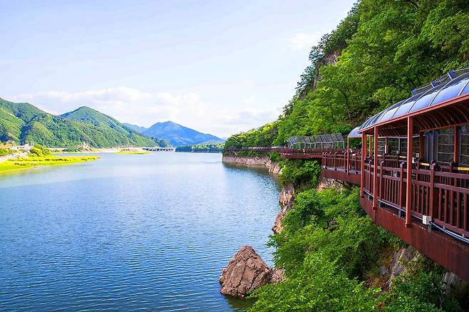 단양강 잔도는 남한강을 따라 조성된 길로, 강물 위를 걷는 듯한 특별한 체험을 제공합니다.