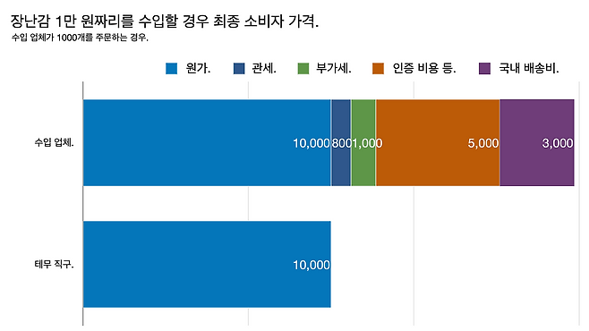 국내 판매자들이 물건을 수입할 때 8% 안팎의 관세와 10%의 부가세를 낸다. 화장품이나 유아용품 등은 ‘KC(Korea Certification)’ 인증을 받아야 하는데 최소 100만 원 이상 든다. 전자 제품은 전자파 인증을 받아야 하고 플라스틱은 폐기물 부담금도 내야 한다. 이것저것 합치면 품목마다 500만 원 정도 드는데 1000개를 판다고 치면 개당 5000원이 붙는 셈이다.
