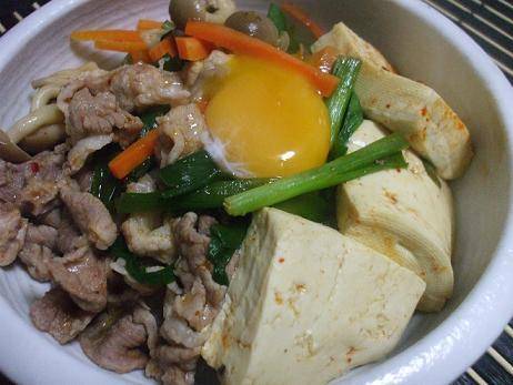 현미밥 위에 구운 소고기와 으깬 두부를 얹고 나물과 함께 비벼서 섭취