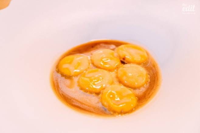 액체 상태의 노른자가 들어간 노른자 모양의 뇨끼. 씹으면 톡하고 터진다.