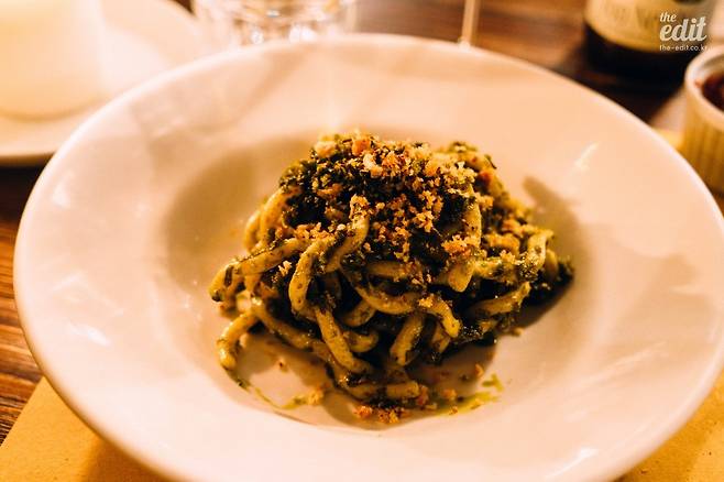 시작부터 범상치 않은 곳임을 느꼈다. 자리를 잡으니 서버가 종이봉투를 하나 가지고 온다. 따끈따끈한 식전빵이었다. 여기는 뭔가 다르다 싶었다. 음식은 두 가지를 시켰다. 스타터에서는 Creamed cod and Chickpeas “schiaccia”, 파스타 중에서는 Pici with chicory, fennel and breadcrumbs. 스타터는 쉽게 말해 ‘크림 대구’ 요리다. 세 번째 사진인데, 대구살을 거의 갈아 놓기 직전까지 찢어놓고 크림과 섞어 놓은 형태다. 터키 아이스크림과 비슷할 정도로 점성이 있고, 한 입 먹으면 대구 맛이 생각보다 강하게 난다. 생선 함량이 굉장히 높은 어묵을 갈았다가 푸딩으로 만든 것 같은 느낌이랄까.