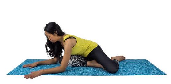 2. 뒷다리를 똑바로 뻗는 비둘기 자세와 달리 다른쪽 다리 역시 앞다리와 비슷한 방식으로 구부려 뒤로 배치한다.