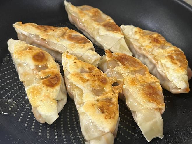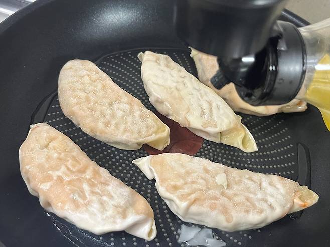 이렇게 하면 만두 겉면은 바삭한 느낌을 살리면서도 속은 촉촉한 상태를 유지할 수 있습니다. 물 없이 그냥 구우면 시간도 훨씬 오래 걸리고 안쪽까지 촉촉하게 만들기 어려워요.