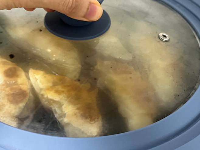 바닥에 물이 살짝 잠길 정도로 소량 붓고 뚜껑을 닫아서 익혀 보세요. 이렇게 하면 내부가 찜기처럼 수분이 가득 차게 되어 만두 속까지 부드럽고 촉촉하게 익습니다.
