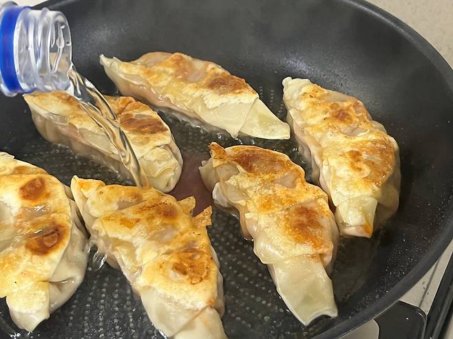 만두의 겉은 바삭하고 속은 촉촉하게 푹 익히는 비법, 바로 물을 붓는 것인데요. 기름에 굽는 만두에 물을 붓는 게 의아하실 수도 있습니다.