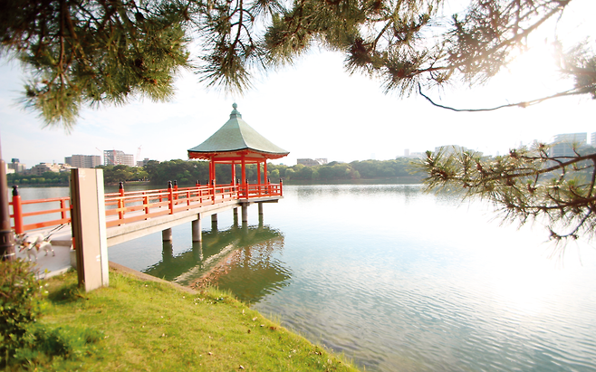 오호리(大濠)는 ‘구덩이’라는 뜻으로, 원래 하카타만으로 이어졌던 습지를 후쿠오카 성 축조 당시에북쪽을 일부 매립해 조성했다. 1929년 공원으로 개장한 이래 정원의 나라 일본에서도 손꼽히는 물의 정원으로 사랑받고 있다.