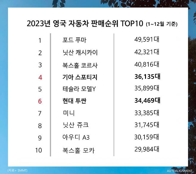 2023 영국 베스트셀링카 포드 푸마와 함께, 뒤를 이어 닛산 캐시카이, 복스홀 코르사, 기아 스포티지, 테슬라 모델 Y, 현대 투싼 등이 TOP10을 차지했다.