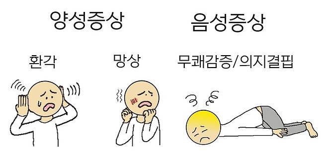 조현병의 증상은 매우 다양하지만, 크게 양성 증상, 음성 증상 그리고 이와 동반된 인지 증상으로 나눌 수 있다.