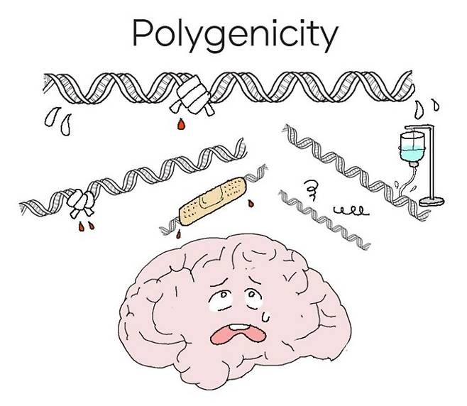 이런 연구가 한결같이 가리키고 있는 것은 조현병의 유전적 소인은 다수 유전자 변이의 복합적인 기여라고 보는 조현병의 다유전성(polygenicity)이다 (그림 3). 하지만 유전적 소인에 대한 대규모 연구에서 나타나는 또 하나의 통찰은, 조현병의 유전적 소인의 기능성 상당 부분이 뇌 발생 과정에 있다는 사실이다. 어린 시절, 특히 태아기부터 뇌 발달 과정에서 비정상적인 변화가 인지, 학습, 감정 조절, 소통 능력 문제 등 조현병 발현의 해부학적 원인이 된다는 뇌발생이론(Neurodevelopmental Theory)의 매우 중요한 근거이자, 연구 표적이 된다.