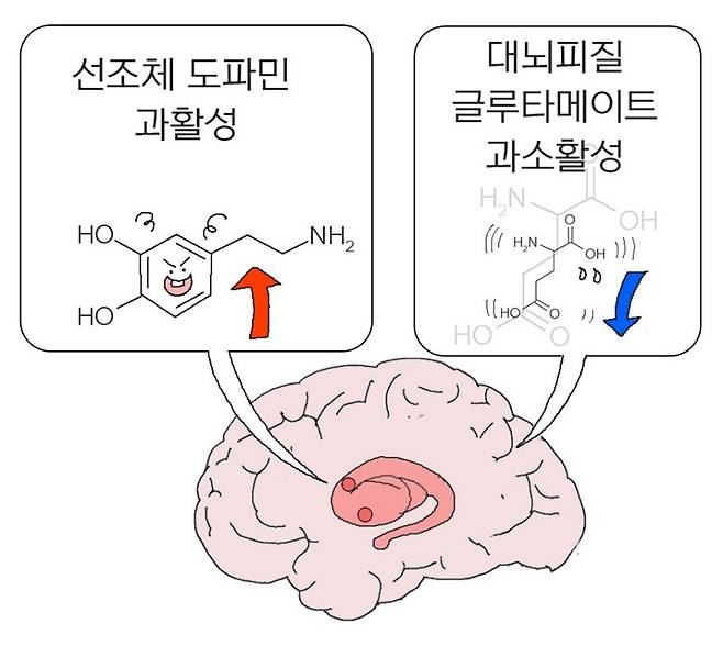 조현병의 증상을 설명하는 또 다른 축은 대뇌피질에서 감소한 글루타메이트 신경전달 물질의 활성이다. 이를 ‘글루타메이트 과소활성화 이론(Hypo-glutamate theory)’이라고 한다. 글루타메이트 수용체를 막는 케타민(ketamine, 전신마취제)과 같은 약이 사람에게 환청과 환각 등 양성 증상을 유도할 수 있다는 연구 결과가 계기가 돼 등장했다[5]. 이후 조현병 환자의 전두엽에서의 글루타메이트 농도가 감소한다는 연구 결과가 나오며 이 이론을 뒷받침했다[6].