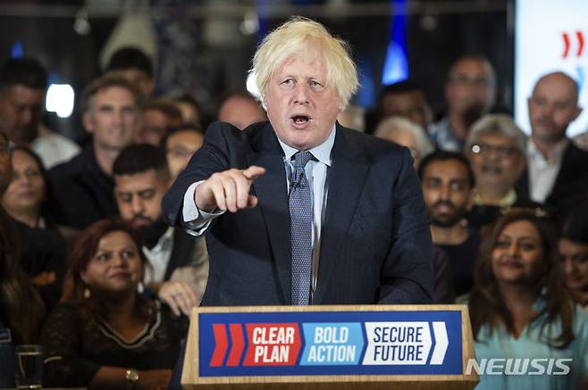[런던=AP/뉴시스] 보리스 존슨 전 영국 총리가 2일(현지시각) 영국 런던의 국립육군박물관에서 리시 수낵 총리가 이끄는 보수당에 대해 지지를 호소하고 있다. 오는 4일 열리는 총선을 앞두고 지난 14년간 집권해 온 보수당은 노동당에 20%포인트 이상 지지율이 뒤지는 것으로 나타났다. 2024.07.03.