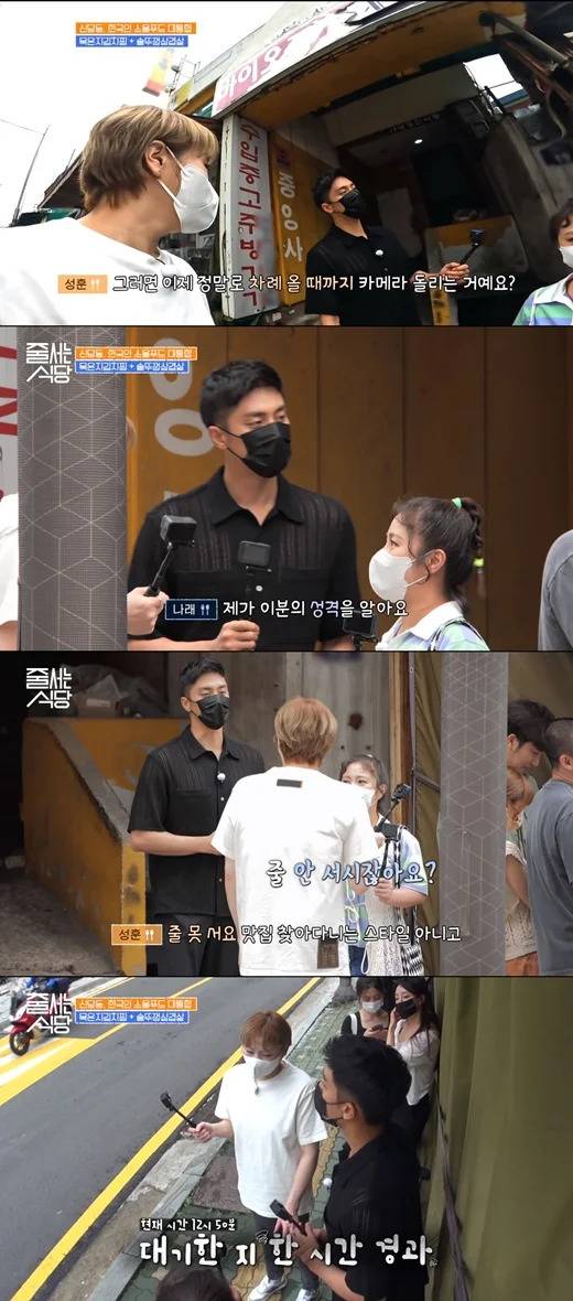 줄을 선 손님들을 본 성훈은 “정말 차례 올 때까지 카메라를 돌리는 거냐”며 제작진에게 물었고, “줄이 있으면 그냥 옆집 가야지”라는 말까지 덧붙였다.