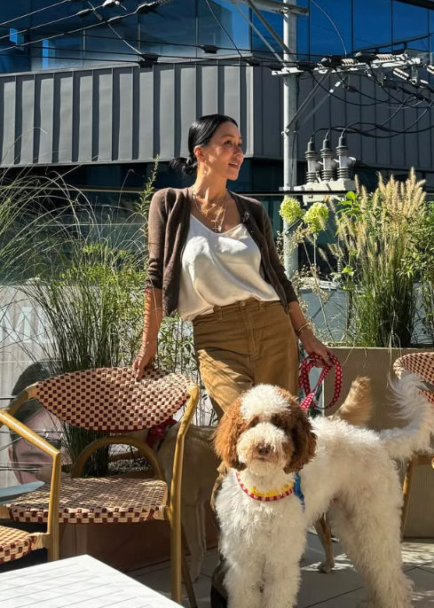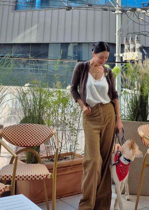 전체적인 톤온톤 스타일링으로 안정감 있는 룩을 연출했고, 자연스럽게 올려 묶은 헤어와 미니멀한 주얼리, 그리고 산뜻한 레드 밴다나를 두른 반려견과 함께하는 연출이 화사한 감성을 더했다.