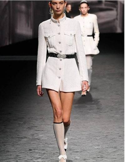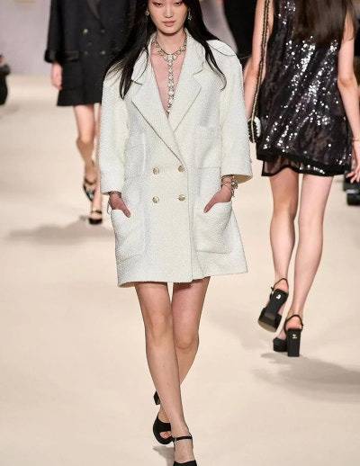 모델이 착용한 동일한 의상 사진을 보면, 심은하의 아름다움이 더욱 돋보입니다. 최근 샤넬 쇼에 등장한 의상 역시 비슷한 느낌을 주며, 샤넬의 클래식한 매력을 다시 한번 느끼게 합니다.