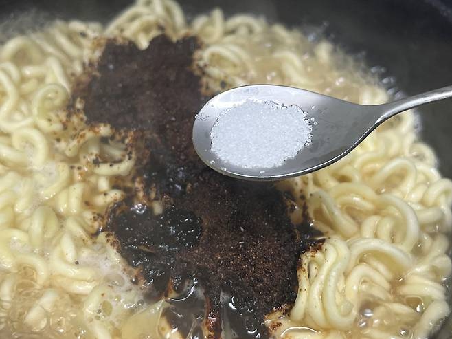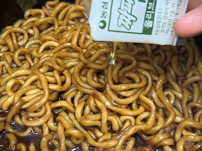짜장라면에 액젓을 소량 넣으면 풍미가 확 좋아집니다. 참치액 또는 멸치 액젓을 작은 스푼으로 1/2스푼 넣어 주세요. 진짜 소량만 넣습니다.