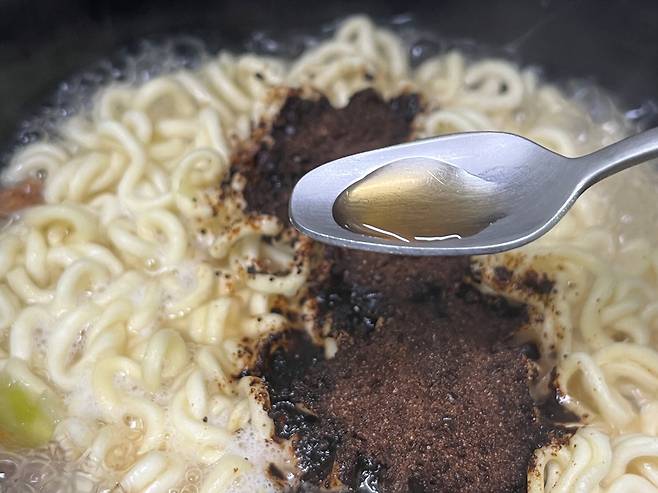 짜장라면에 액젓을 소량 넣으면 풍미가 확 좋아집니다. 참치액 또는 멸치 액젓을 작은 스푼으로 1/2스푼 넣어 주세요. 진짜 소량만 넣습니다.