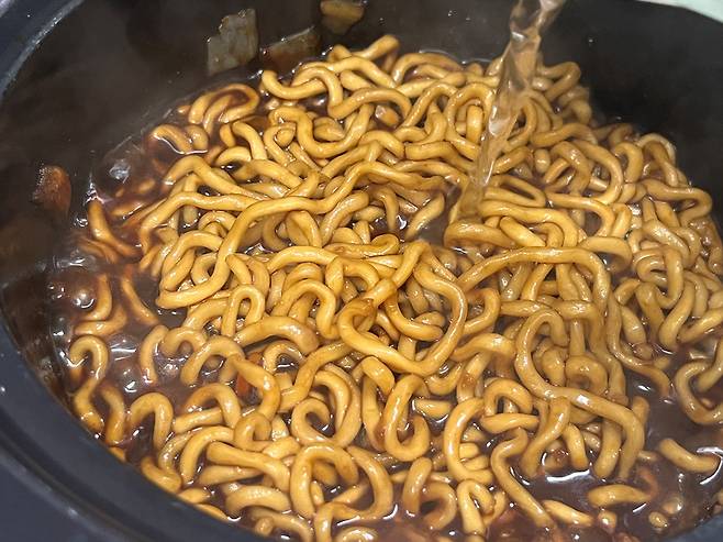 약불로 줄인 다음 면과 양념을 섞어가며 끓여 주세요. 물을 따라내지 않으므로 천천히 졸이는 것이 중요합니다.