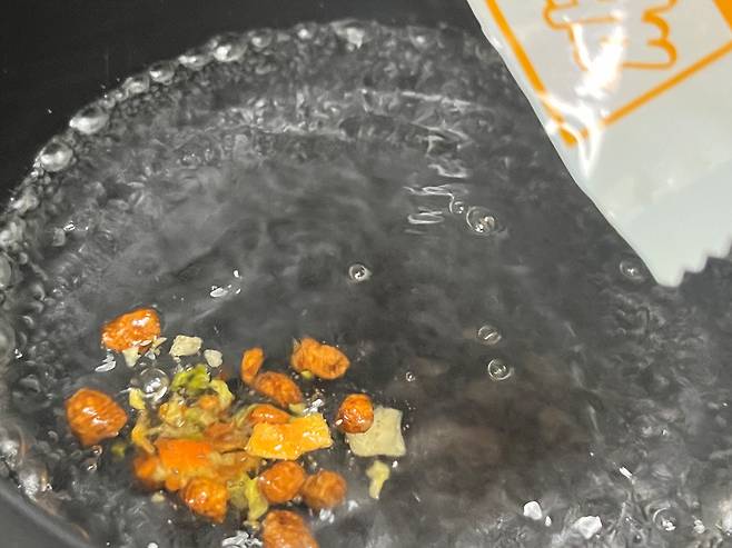 물 330ml를 넣고 건더기 수프를 먼저 넣습니다. 중불에서 팔팔 끓여 주세요.
