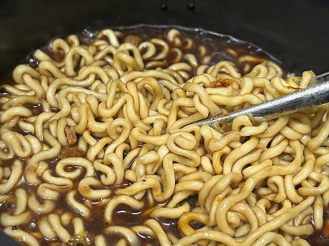 약불로 줄인 다음 면과 양념을 섞어가며 끓여 주세요. 물을 따라내지 않으므로 천천히 졸이는 것이 중요합니다.