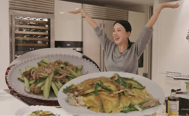 엄정화가 소개한 레시피는 설탕 대신 알룰로스를 사용한 저당 골뱅이 무침과 밀가루를 쓰지 않은 NO 밀가루 파전 등이다.