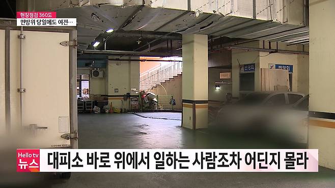 상가 입주 근로자 : (대피소 어딨는지 알고 계세요?) 난 잘 모르는데…여기 경비실에 경비 아저씨 없어요? (선생님은 잘 모르세요?) 난 잘 모르죠. (지하 2층이 대피소인 걸 모르고 계세요?) 예.