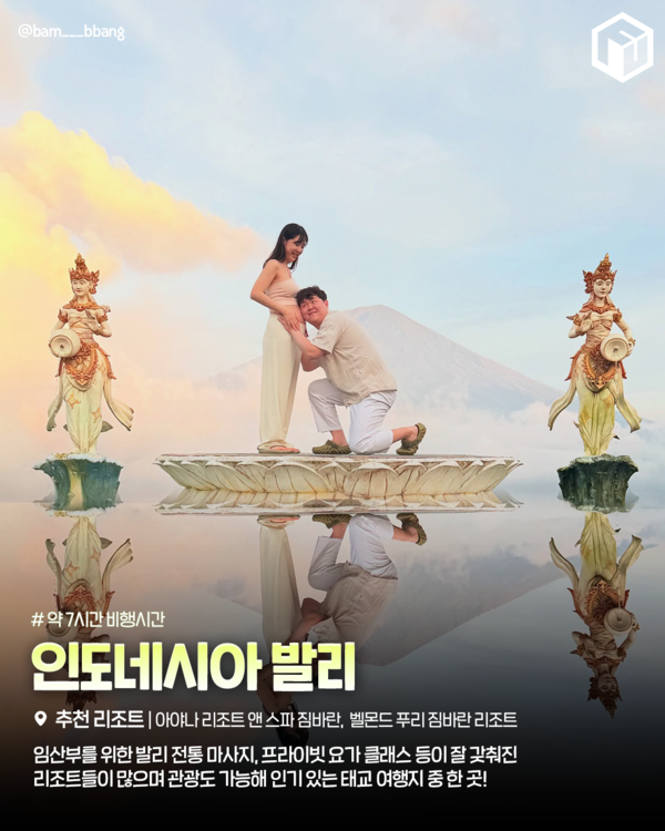 발리는 태교 여행지 중에서도 약 7시간의 비행으로 다소 길지만 힐링 요소가 가장 많은 곳으로 손꼽힙니다.
