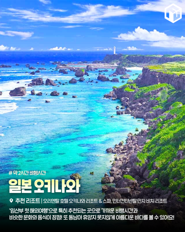 일본 오키나와는 비행시간이 약 2시간으로 짧아 임산부들이 가장 많이 찾는 근거리 여행지 중 하나입니다.이동 거리가 짧고 교통이 편리해 첫 해외 태교 여행지로 추천하는 곳입니다.