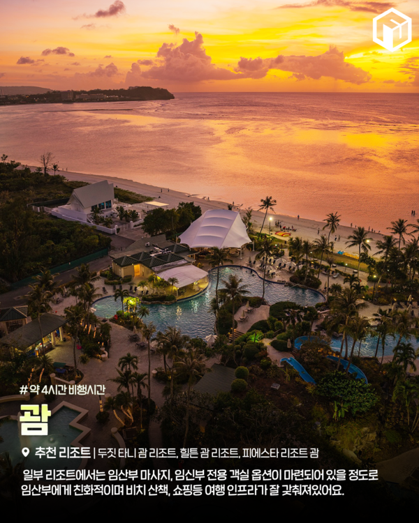 괌은 미국령으로, 의료 인프라가 잘 갖춰져 있어 임산부들에게 안심되는 여행지입니다. 비행시간도 약 4시간으로 비교적 짧고, 리조트 중심으로 쇼핑과 휴식을 함께 즐길 수 있어 다양한 일정이 가능합니다.