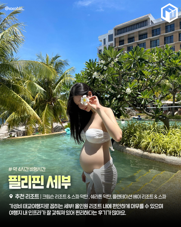 필리핀 세부는 임산부 여행 커뮤니티에서 ‘가성비 갑’으로 자주 언급되는 태교 여행지입니다. 리조트 안에서 대부분의 활동이 가능해 이동이 최소화되고, 리조트마다 스파, 수영장, 조식 뷔페가 잘 갖춰져 있어 만족도가 높습니다.