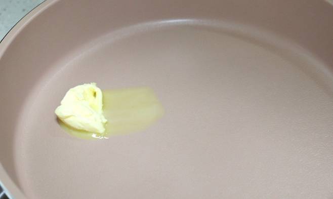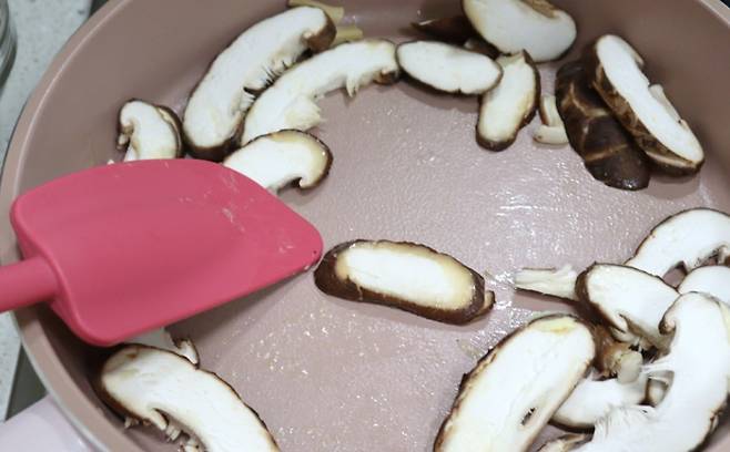 프라이팬에 버터를 두르고 손질해 두었던 표고버섯을 넣어줍니다.