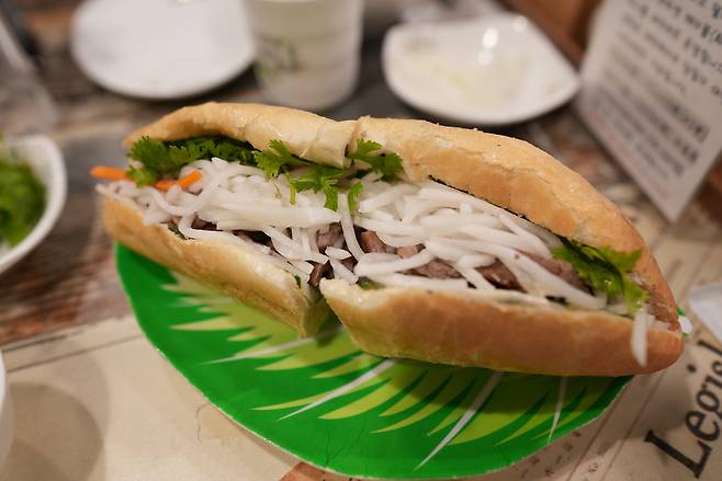 이곳의 바게트는 조금 바삭해서 힘들었으나 맛있어서 입천장 터지는 것을 감수하며 먹었어요. 안쪽에 들어간 무도 맛있고, 반찬으로 주신 절임 양파도 함께 먹으면 더 맛있게 드실 수 있어요.