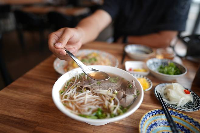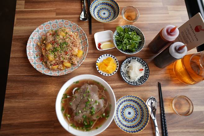 파인애플 볶음밥과 양지 쌀국수가 등장! 먼저 주신 고수를 잘 배분해서 쌀국수에 넣습니다. 쌀국수에 고수를 넣으면 고기 육수의 맛이 훨씬 깔끔해져요!