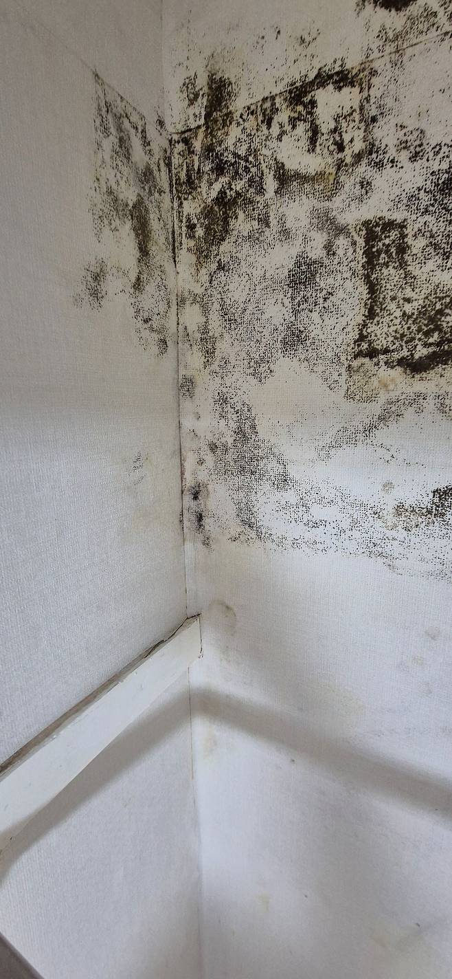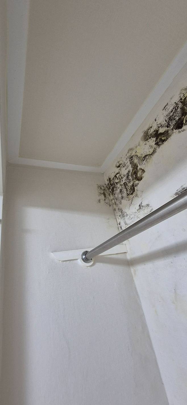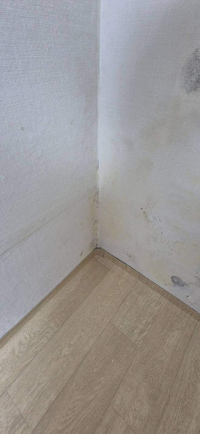 저 벽면 바로 뒤에는 화장실이 있습니다. 안방역시 화장실과 맞대어 있는데 결혼전 리모델링 시 안방 장롱을 걷어내니 화장실과 맞다은 벽면에 엄청난 양의 곰팡이가 있었습니다..